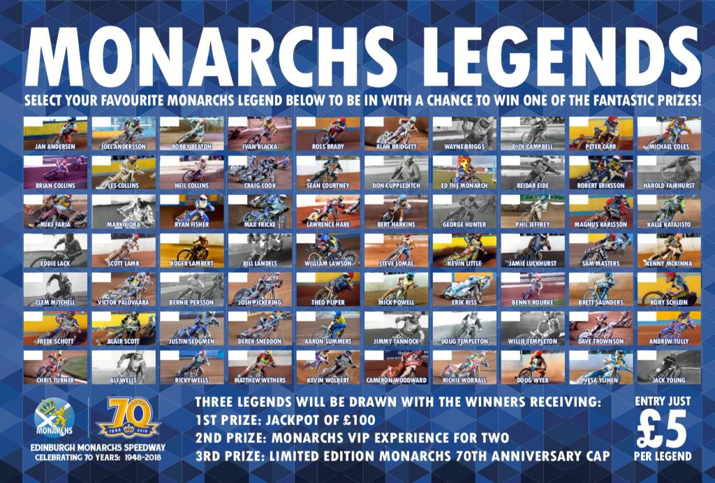 The Monarchs Fans Trust will continue to sell Monarchs Legends on the card on Friday night as the team takes on the Workington Comets in the KO Cup Final. There are about 25 legends left for sale on the board, with the chance of winning one of 3 prizes, £100 cash, Monarchs VIP for 2 or a 70th Anniversary cap. Committee members will be at the gazebo or in the container next to the club shop before the meeting so get your legend before they sell out.