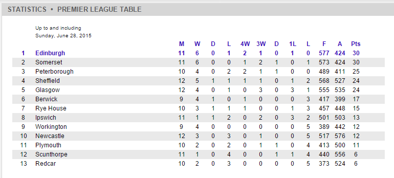 The 500th Meeting at Armadale on Friday saw Edinburgh take top spot in the Premier League for the first time in 2015. The match was spoiled by the late arrival of a number of Plymouth riders which made it a very one sided affair with a final score of 64-28. This was as a result of a major accident on the M6, the start of the meeting was put back half an hour but even with that delay Morten Risager missed his first ride and Armadale legend Ryan Fisher missed two only arriving just before heat 9. The Monarchs can only beat what was put in front of them and that is exactly what they did as three riders hit a maximum score: guest Nick Morris, captain Craig Cook and a special paid 18 points from Erik Riss. Second guest Theo Pijper, Max Clegg and in particular Justin Sedgmen also scored well as only Jack Holder put up any real resistance for the Devils. At the end of the season all that will matter is the Monarchs took the 3 match points and went top and they hope to stay there. League table courtesy of the official Edinburgh Speedway webpage http://www.edinburghmonarchs.co/statistics/.